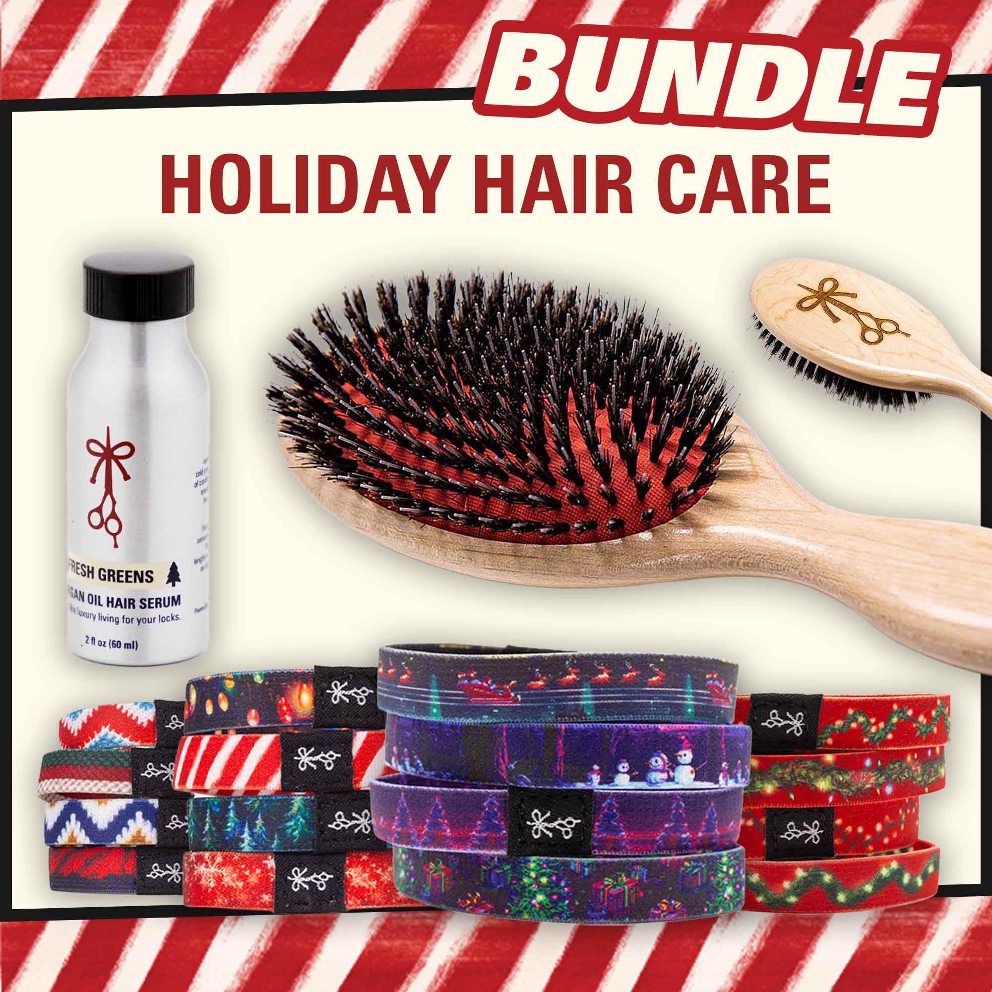 The Holiday Hair Care Bundle pairs our best-selling Mane Hog Boar Bristle Brush with your choice of Hair Serum and the full set of Holiday Hair Ties. The ultimate gift for guys with long hair (or anyone serious about their mane).