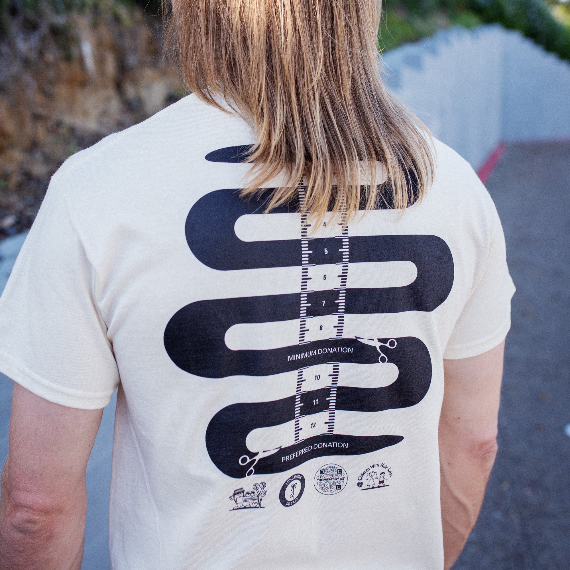 On the back of each t-shirt is a growth measuring tool. Horizontal lines spaced at one inch apart graphically illustrate progress toward your donation goal. The eight inch mark is notated with “minimum donation,” while the 12 inch mark is notated with “preferred donation.”